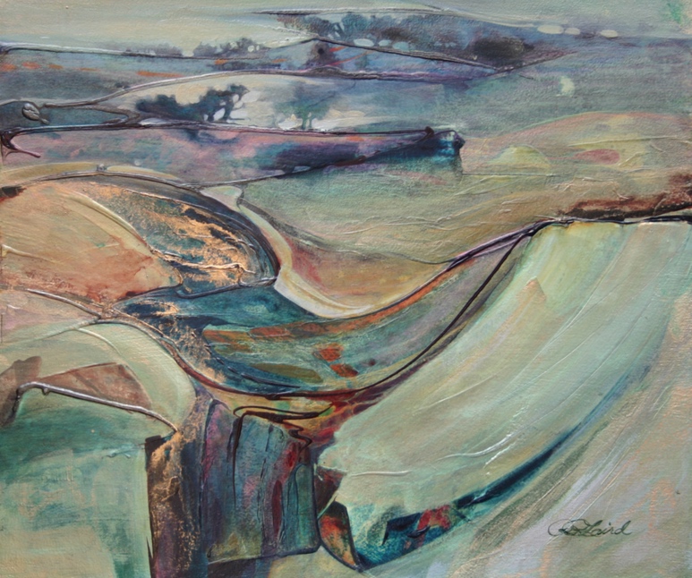 unique qualities of flowing transparent pure watercolor to create mysterious rhythmic works, while in other pieces she incorporates a variety of other watermedia. In addition to painting, she has expressed her vision in: forged metal and wood sculpture as well as leaded glass design and residential architecture. The continuing source of inspiration for Laird’s work is a lifetime interest in cycles and natural transitions and connections.